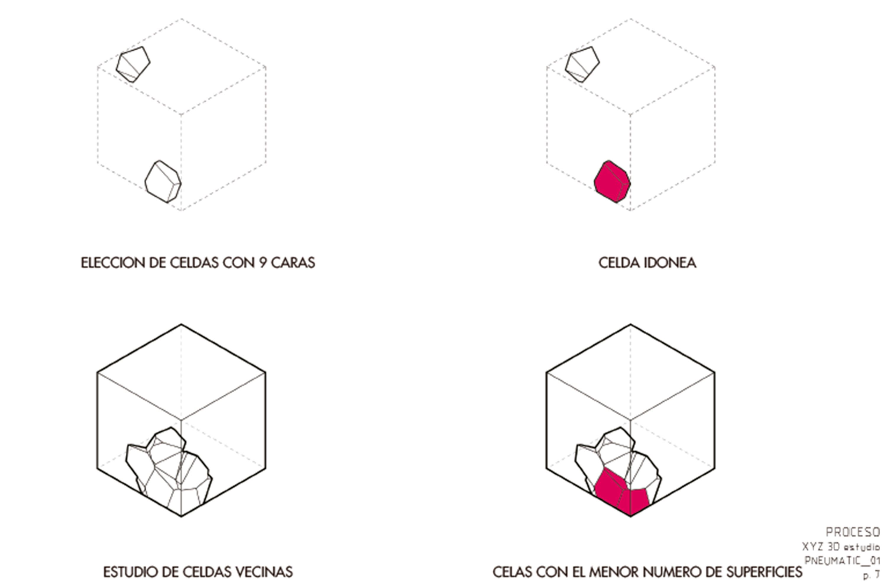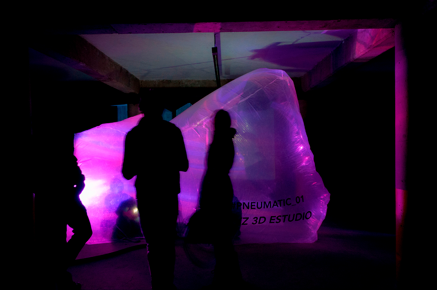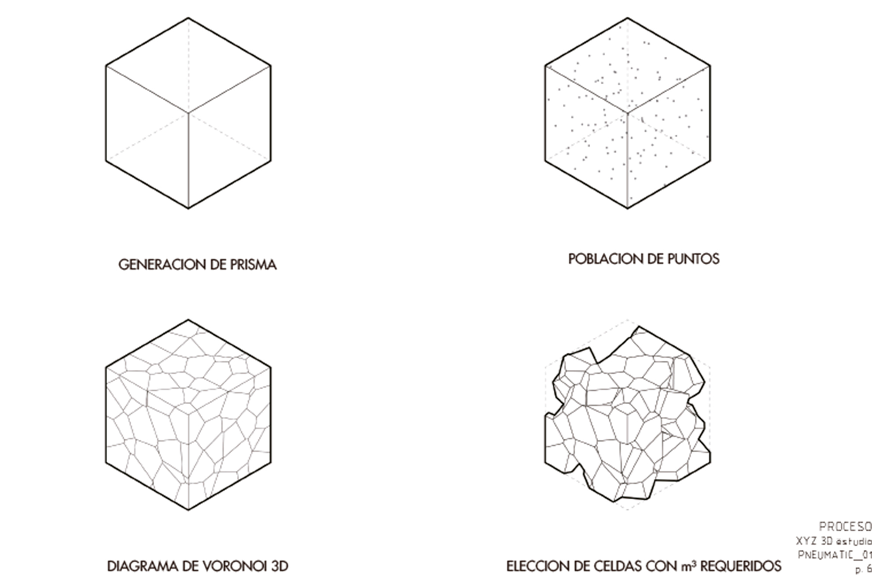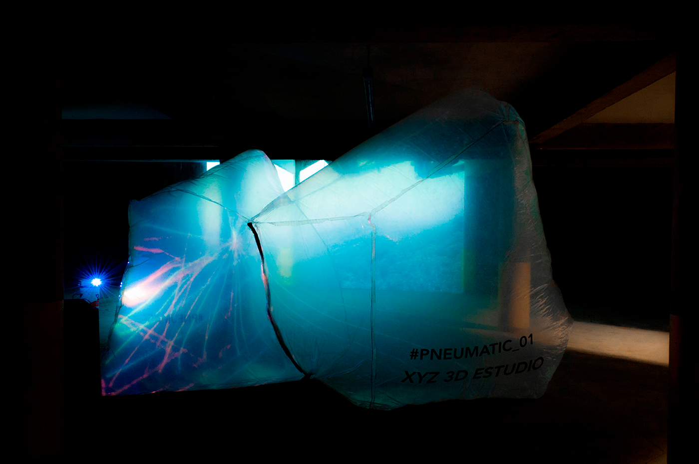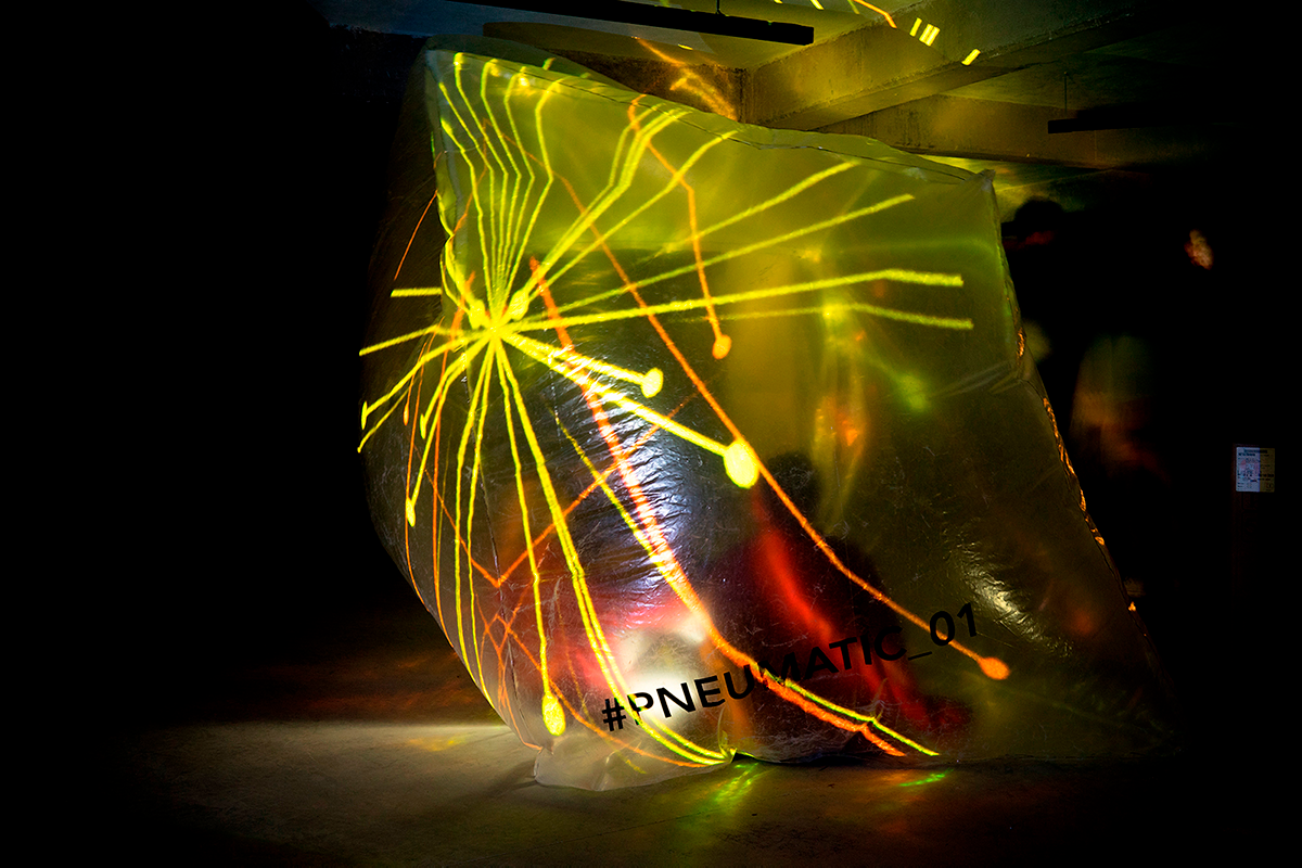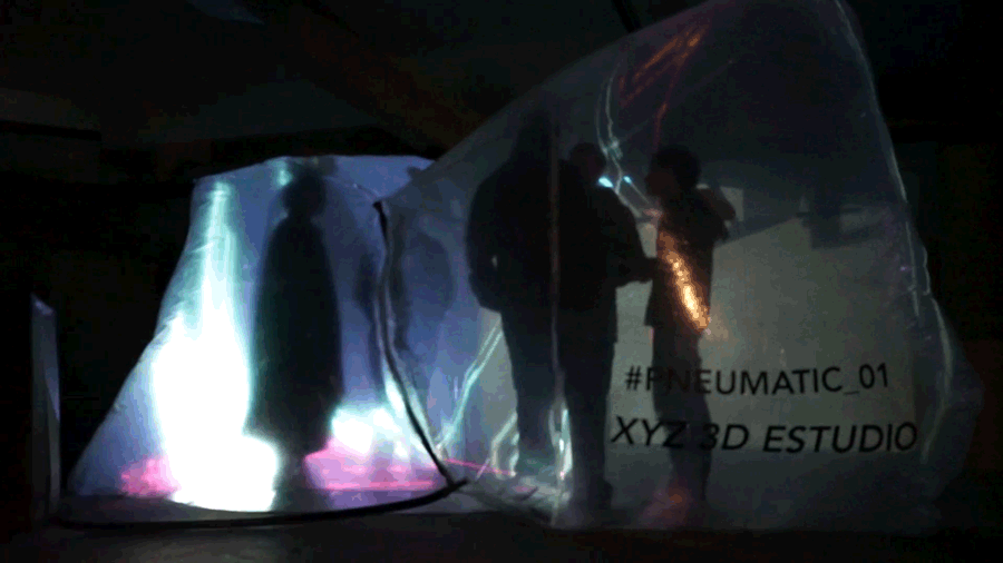 Neumático,ca. (Del lat. pneumatĭcus, y este del gr. πνευματικός, relativo al aire). 1. adj. Que funciona con aire u otro gas. La generación de la forma contenedora se basa en un diagrama de voronoi 3D. Simplemente delimitamos un prisma rectangular, el cual poblamos de puntos donde la intersección de éstos generan plano, y así formando celdas. Una vez escogida la celda idónea, desarrollamos las superficies de la geometría para obtener sus caras y así transportarlas al plástico. Finalmente unimos cada una de las caras con su pestaña con herramientas de termofusión. El plastico siendo un material económico facilita la generación de superficies extensas sin crear un impacto grande dentro de cada presupuesto de un proyecto, además permite contener el aire y de esta manera esculpir estéticas nuevas de una manera sencilla y rapida. Utilizando la tecnología de video mapping le damos vida a PNEUMATIC_01 proyectando sobre su superficie animaciones que lo vuelven un espacio dinámico que puede ser utilizado para diferentes fines. Gracias a esta técnica podemos crear proyectos atractivos para cualquier tipo de evento con un presupuesto relativamente bajo y en un tiempo de construcción rápido.