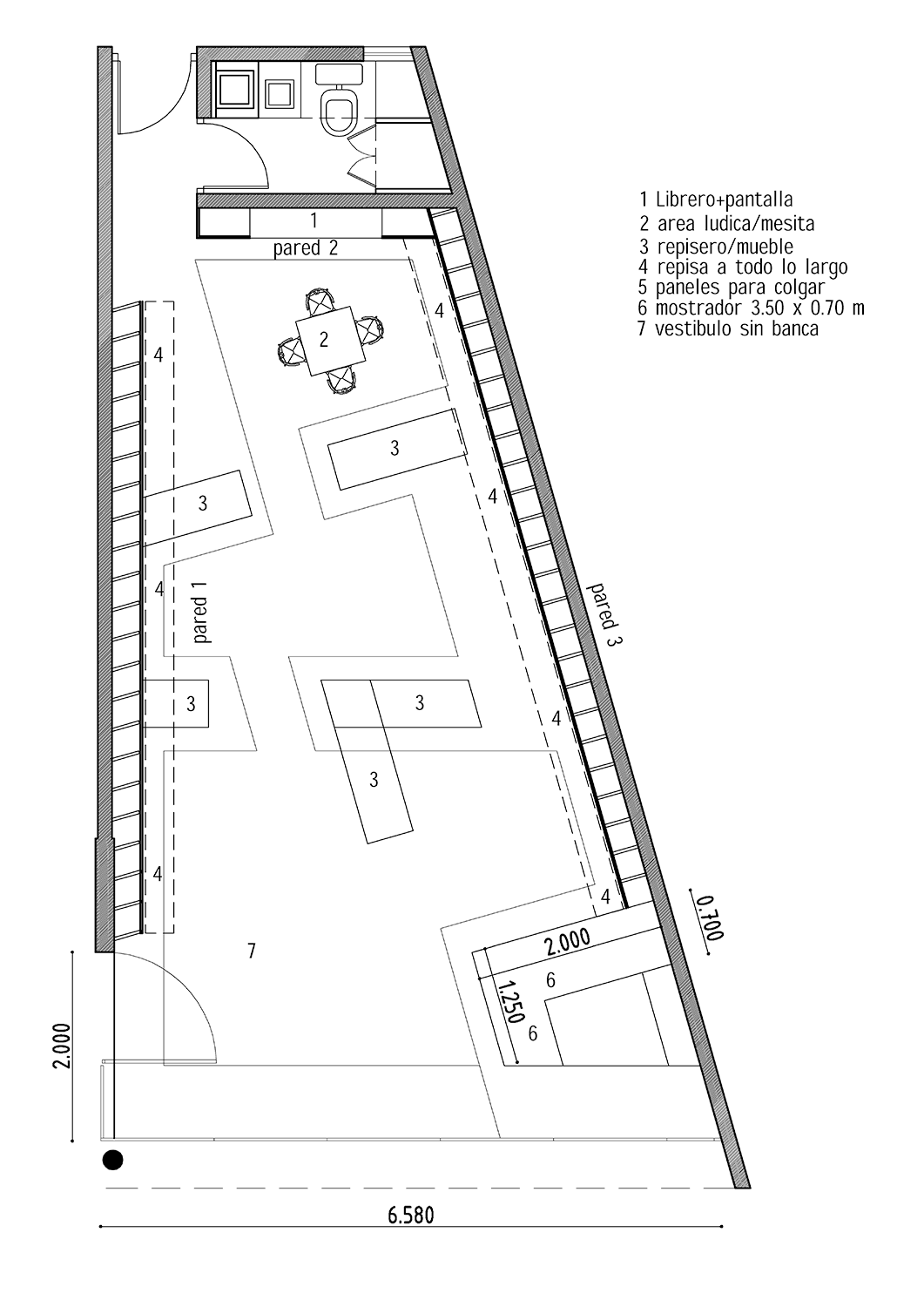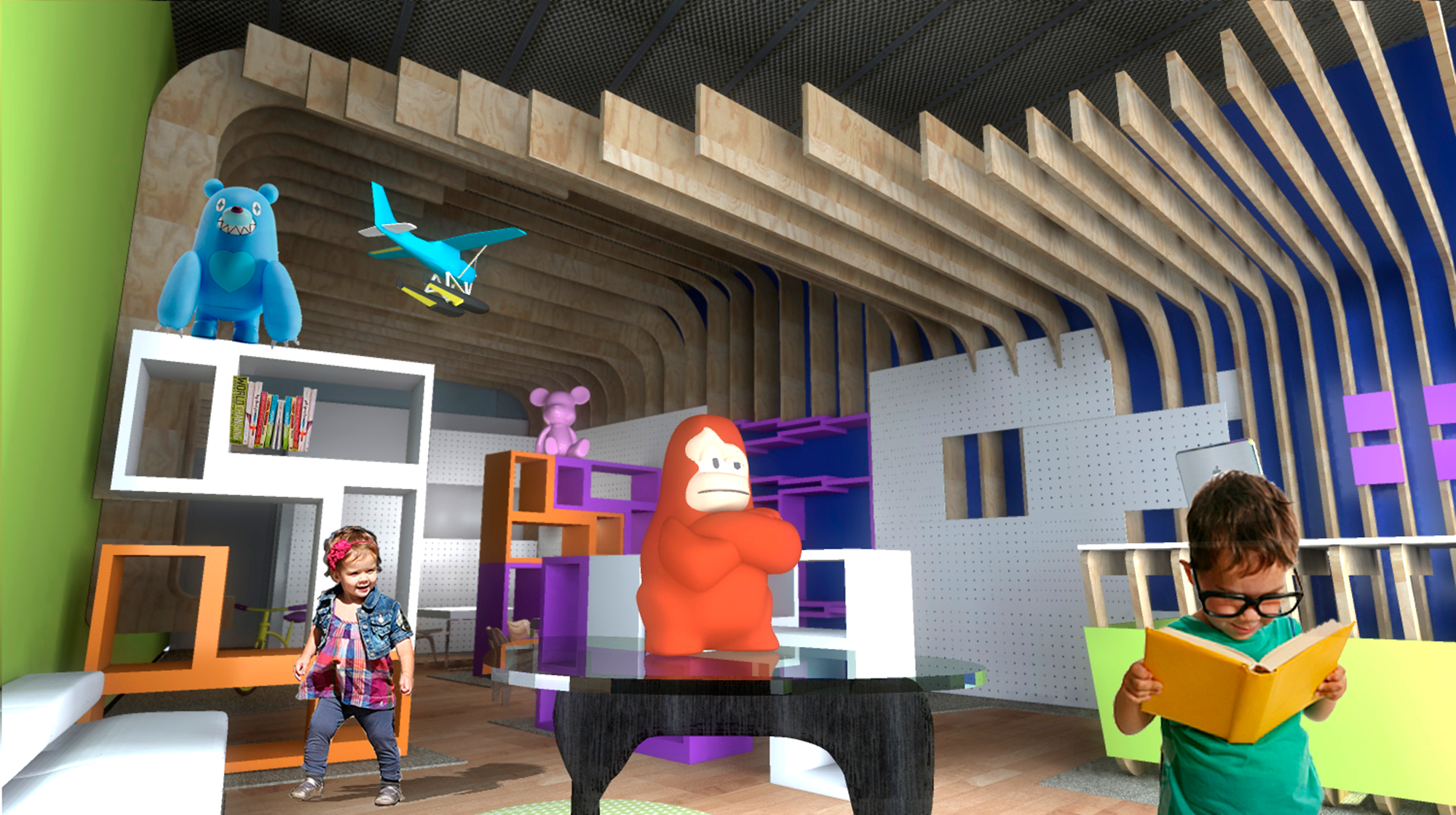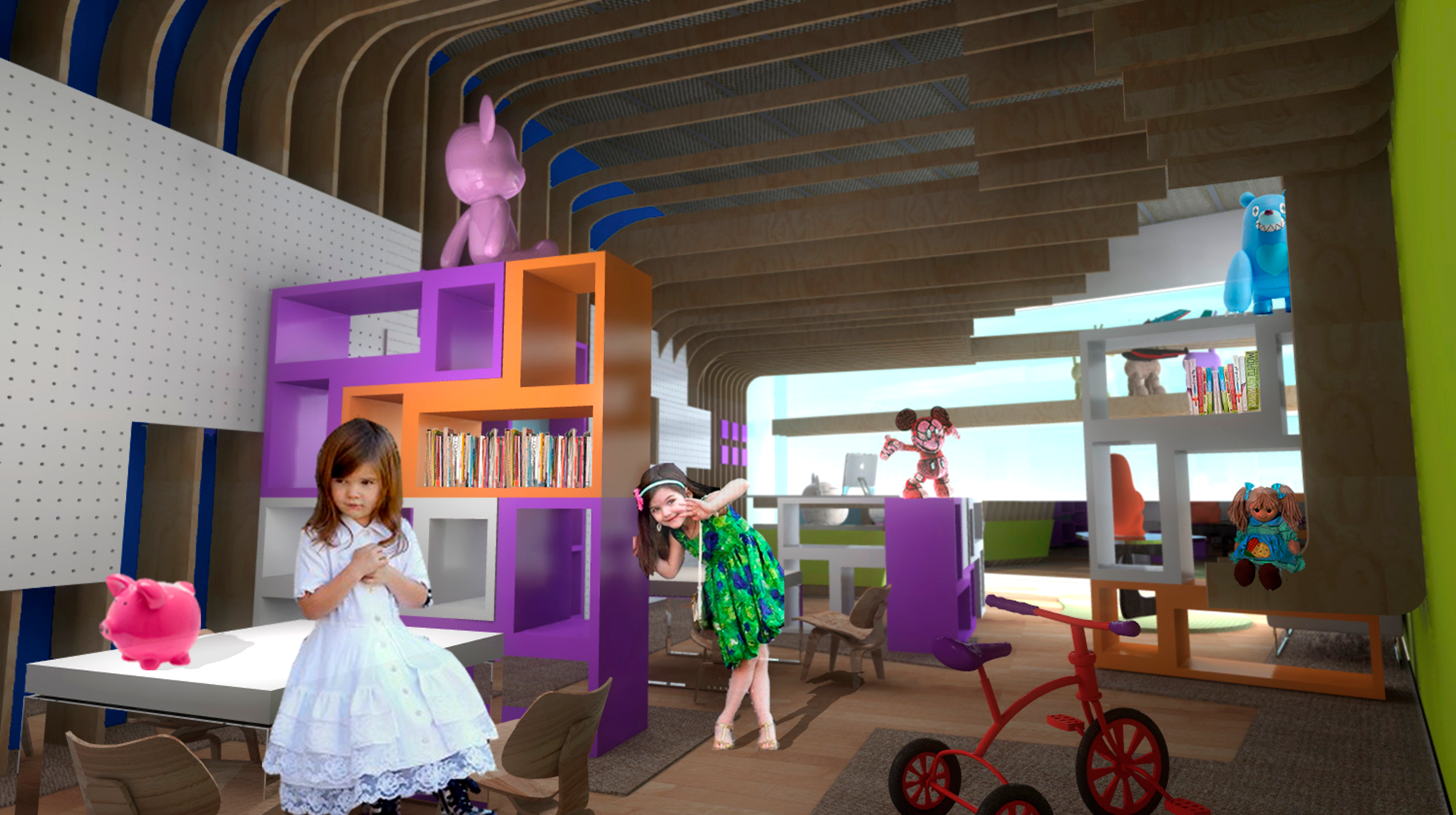 El proyecto arquitectónico pretende crear una "tienda conceptual", o sea una tienda con una idea que lo sustenta, más allá del almacenamiento de juguetes para su venta. Una "tienda - recorrido" o "tienda - cuarto lúdico", en donde el atractivo no es solo el juguete, sino el espacio que lo exhibe, su imagen y consideración hacia el usuario, dando un valor intrínseco a su exhibición - venta. Se pretende lograr una totalidad y continuidad espacial, una permeabilidad visual por seguridad tanto del usuario niño como por control administrativo. El panel perforado cumple con una mejor función que el panel rallado, ya que tiene la misma flexibilidad horizontal tanto como vertical. La fachada, así como el plafón juega con la basta altura que se dispone en el local, dando una sensación de mayor amplitud y profundidad. Las diferentes alturas del plafón evocan las diferentes edades del niño, su desarrollo y su crecimiento a lo largo del tiempo. Los muebles cumplen con las medidas estándares sugeridas. Cada mueble es una "L" independiente que logra dar diferentes configuraciones a lo largo y ancho a manera de tetris, sirviendo como repisas o mesas, dando flexibilidad de exhibición.